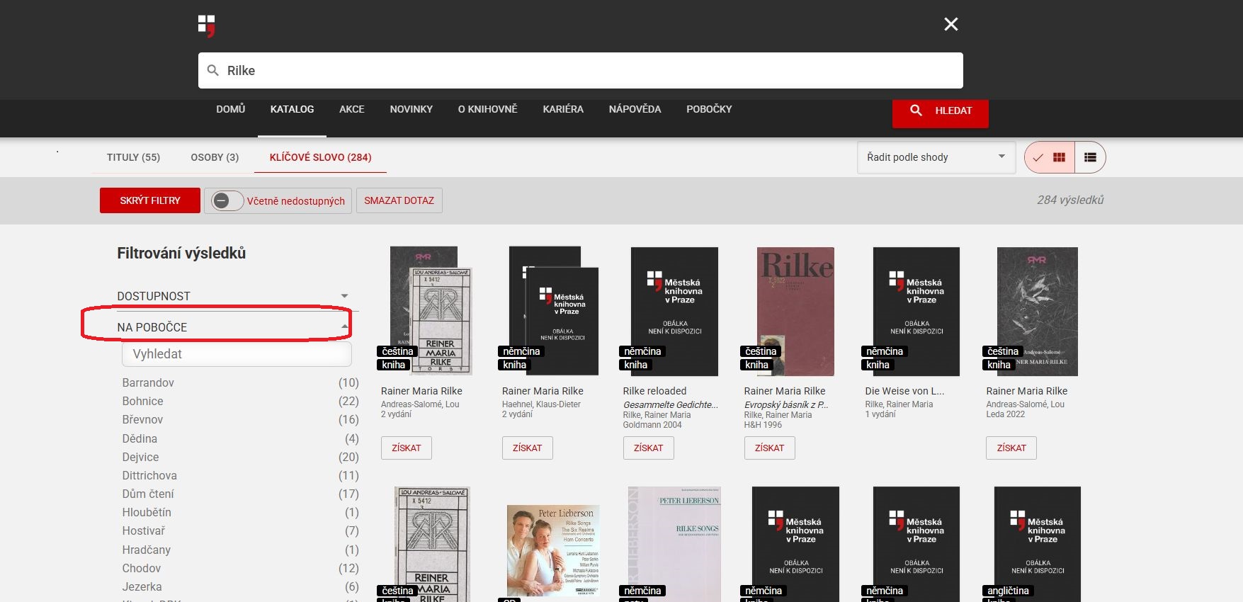 Tip! Jak zjistíte, že je knížka právě přítomná v konkrétní pobočce? Zkombinujte filtr „Dostupnost“ => „Přítomné k půjčení“ a filtr „Na pobočce“ => vyberte konkrétní pobočku.