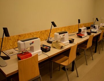 Hlavním vybavením Ateliéru jsou tři šicí stroje a jeden speciální – overlock. K dispozici tu jsou nitě, látky, nůžky, krejčovská panna, žehlička, žehlicí prkno a všechny další věci potřebné k šití. Kromě toho tu jsou i háčky, pletací jehlice a vlny pro milovníky pletení a háčkování. Pořádáme pravidelné workshopy:
